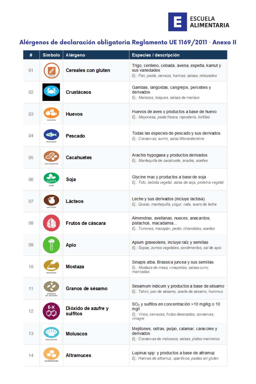 A continuación se muestra una tabla de alérgenos con los 14 grupos incluidos en la normativa europea.